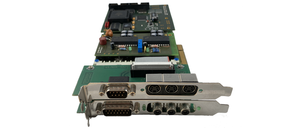 Mit der Option PCI wird das Einplatinen-Farb-DE µCDE zu einer kompakten Steckbaugruppe für Computer mit PCI-Slots. Hierbei erfolgt über den PCI-Bus lediglich die Versorgng der DE, alle Schnittstellen, der Inkremental-Enkoder-Eingang und Video In/Out stehen an den Slotblechen zur Verfügung. Die Baugruppe belegt zwei Steckplätze.